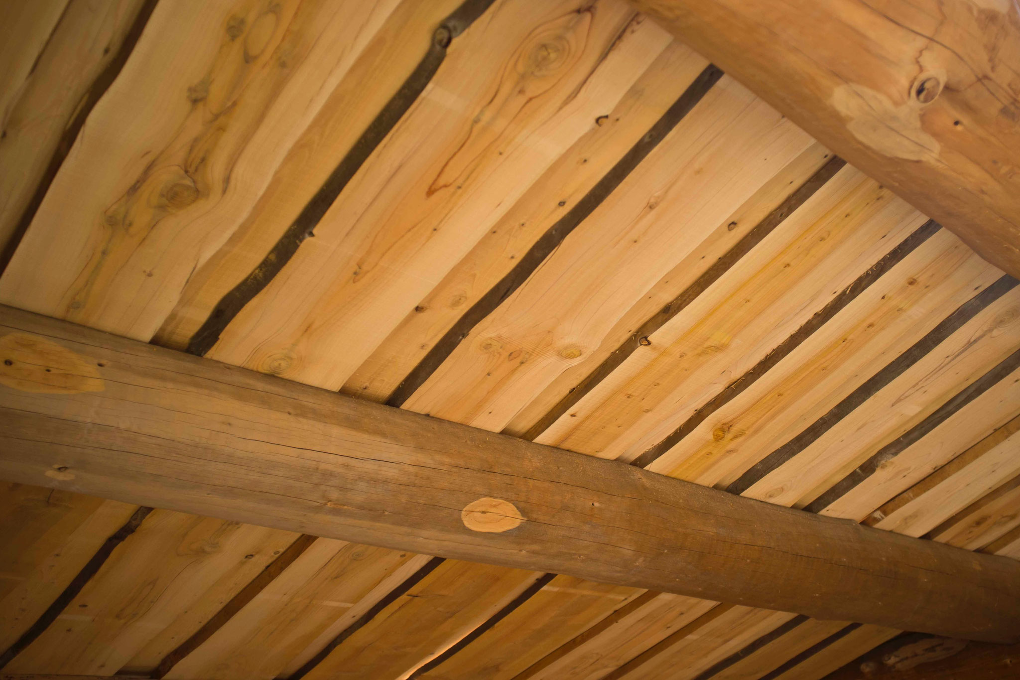 Un cocon de rondins de bois brut diffusant son parfum d'essences de cèdre blanc sous un toit végétal offrant fleurs ou manteau neigeux selon la saison.